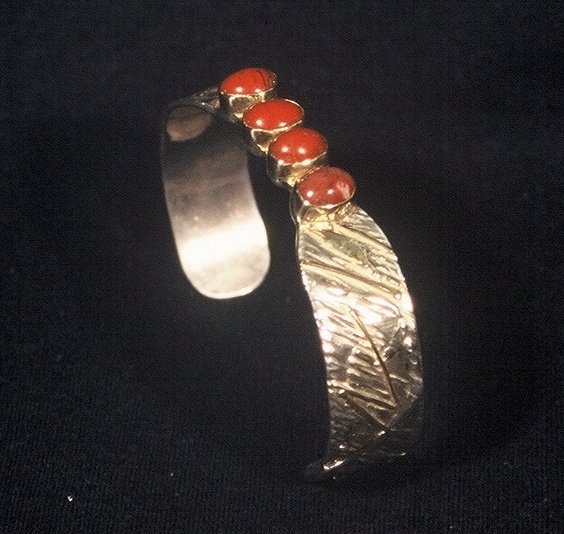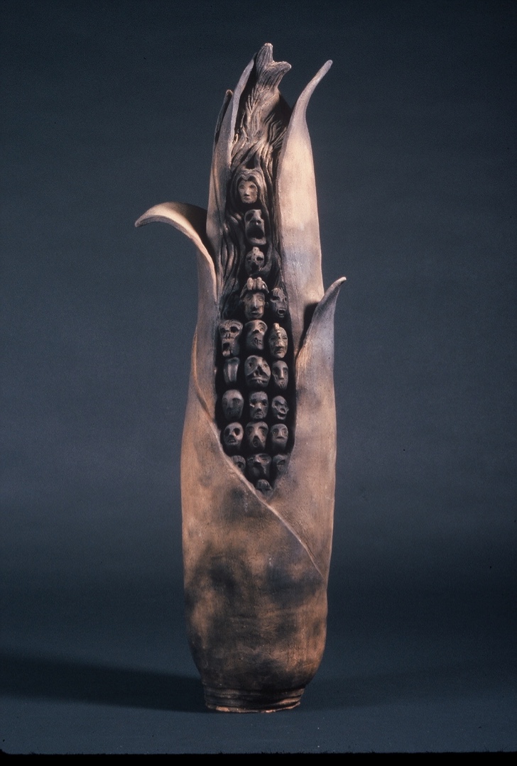 Kuna woman, oil bar on paper (left); bracelet, 14k gold, .925 silver, carnelian (middle left); Corn mother with ancestor kernels, reduction-fired ceramic (middle right); Junkatapurse “horse’s head” incensario, soapstone (right)
